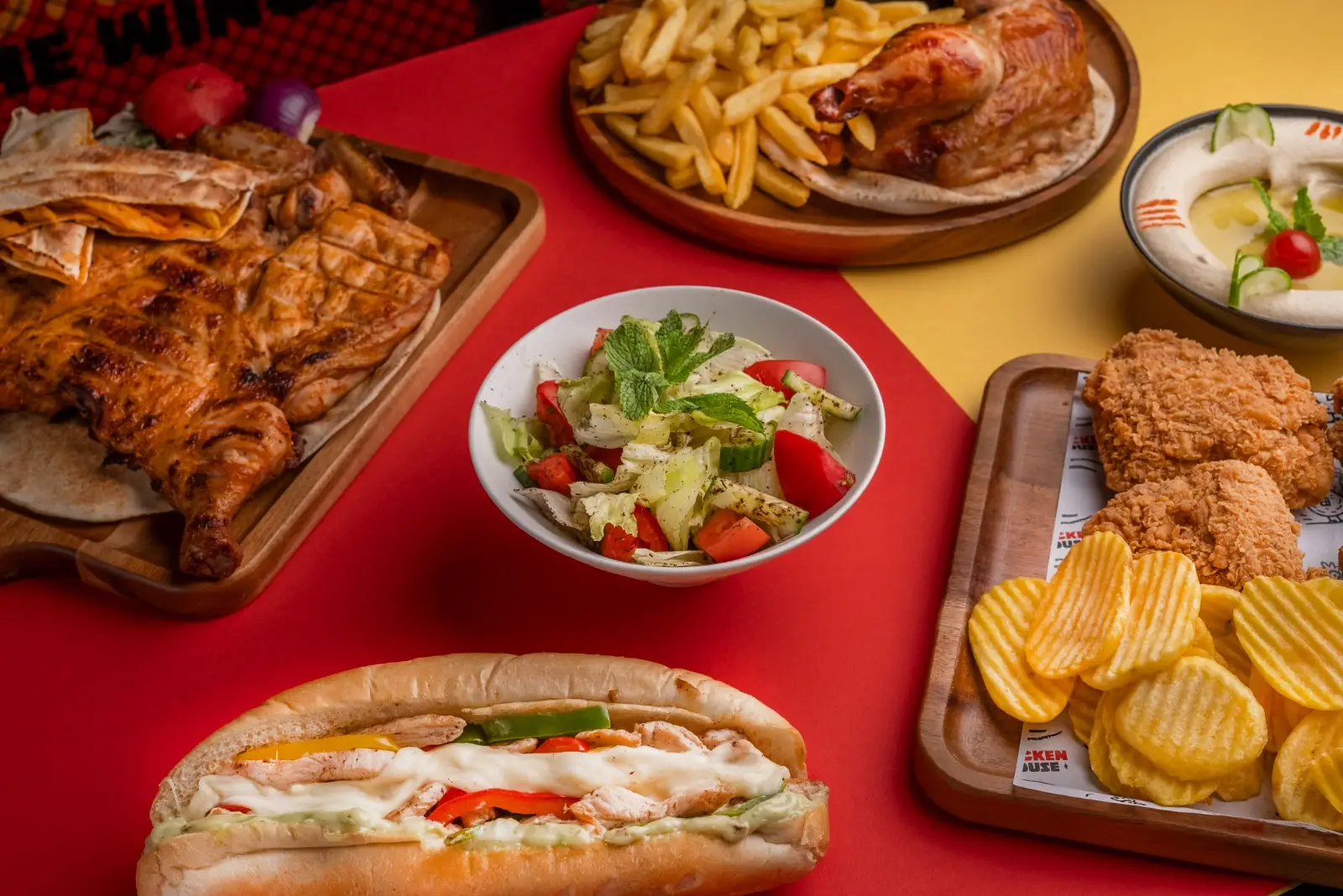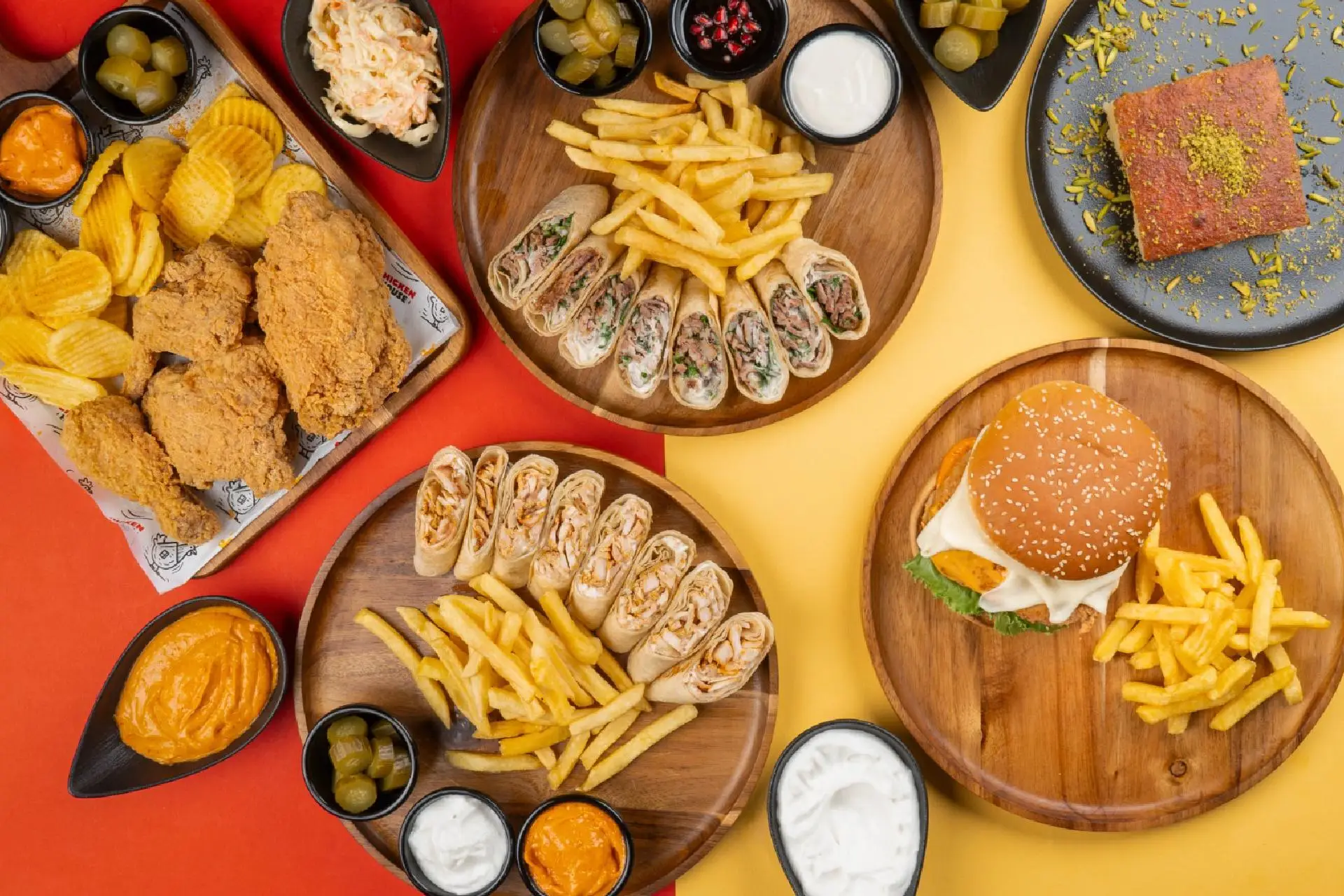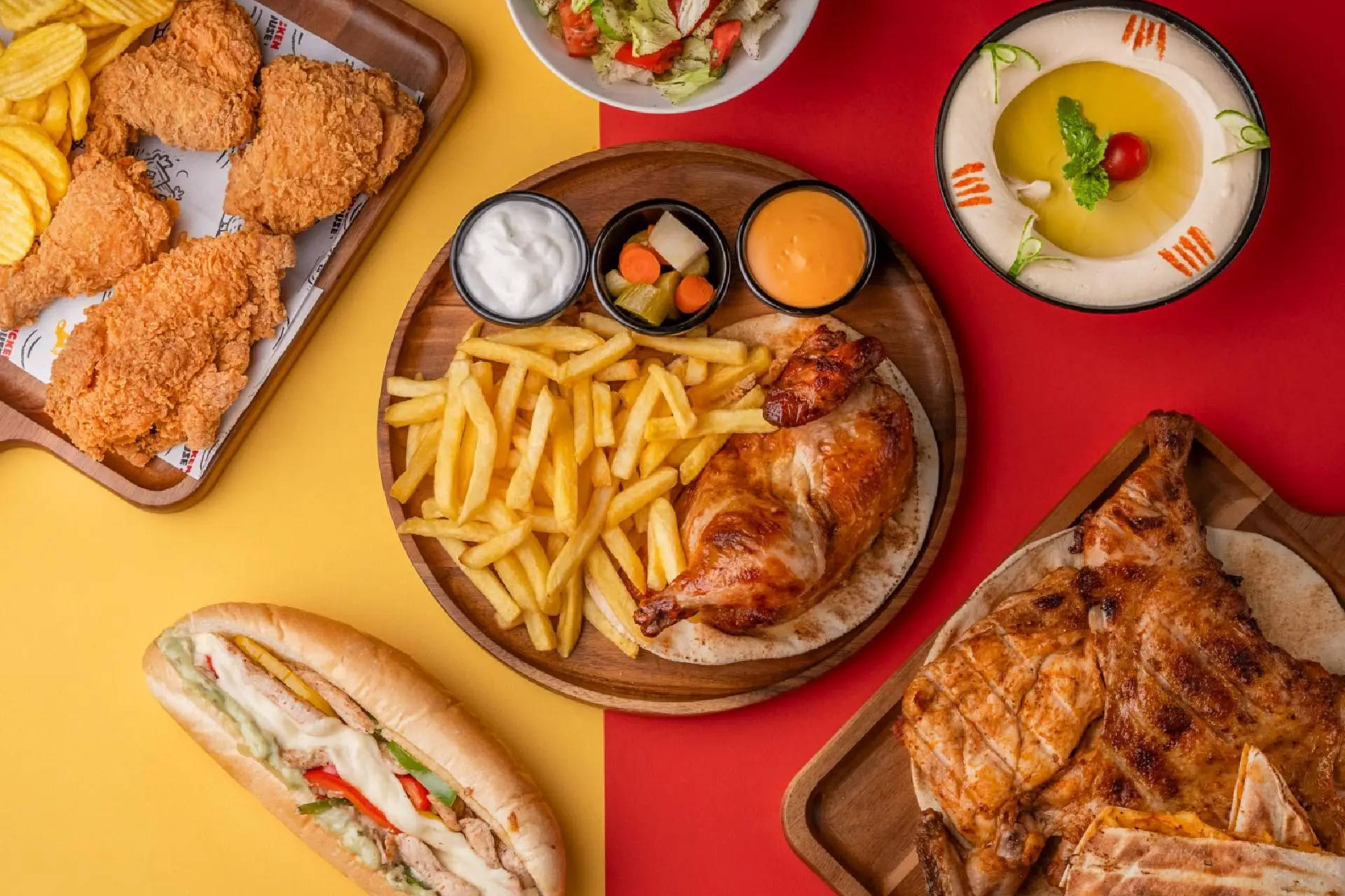 A diverse selection of delicious dishes including: Grilled Chicken β Brosted Chicken β Shawarma β Fajitas β Burgers β Roasted Chicken β Fried Chicken β Sandwiches